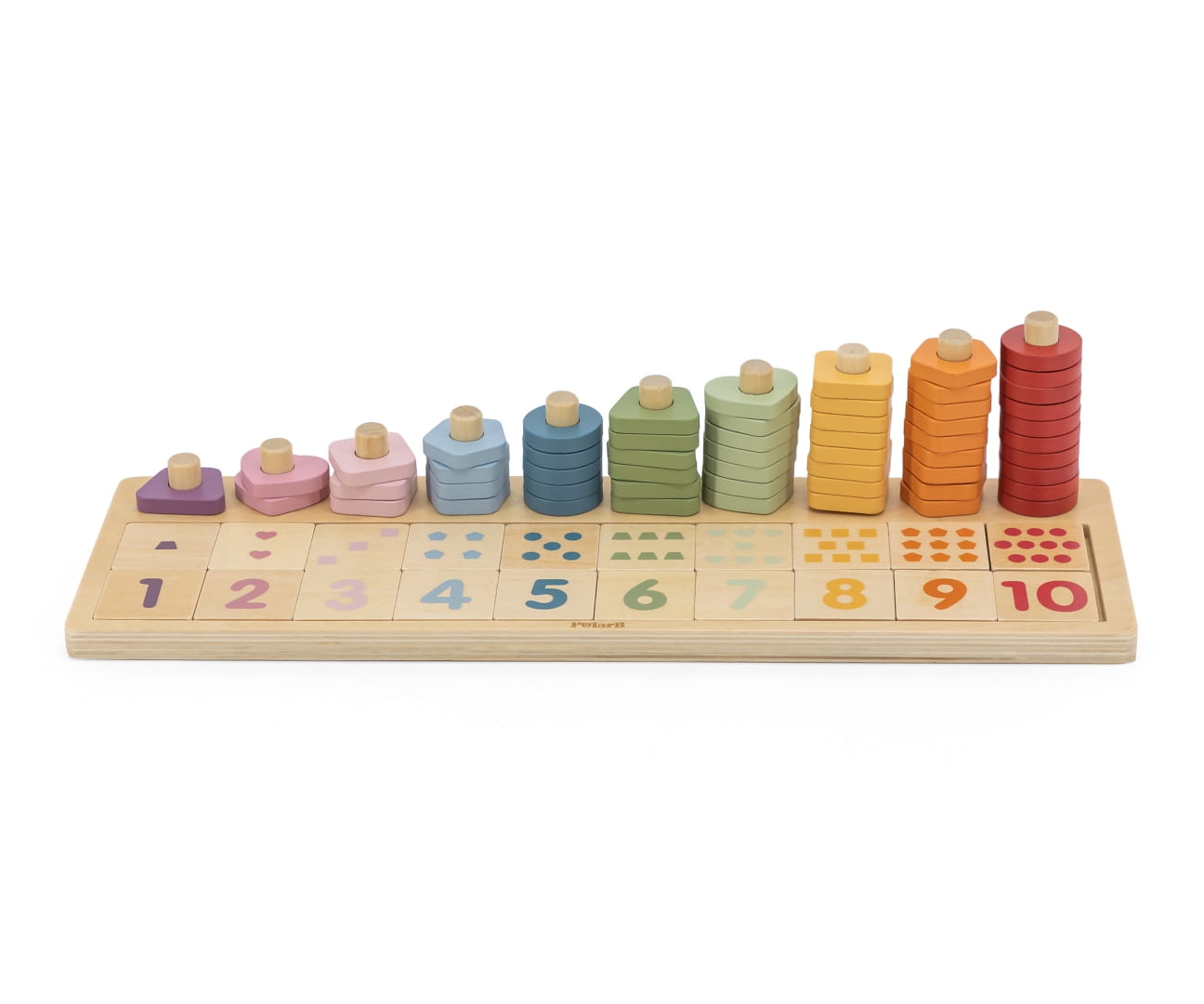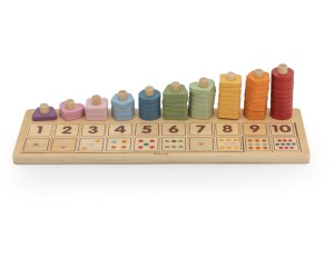 Składa się z 55 koralików, 20 klocków z numerkami i figurami geometrycznymi, podstawy i 10 kołeczków.