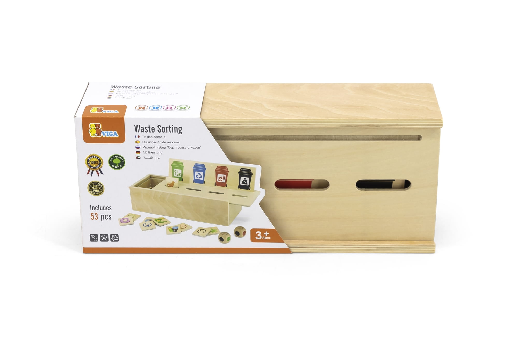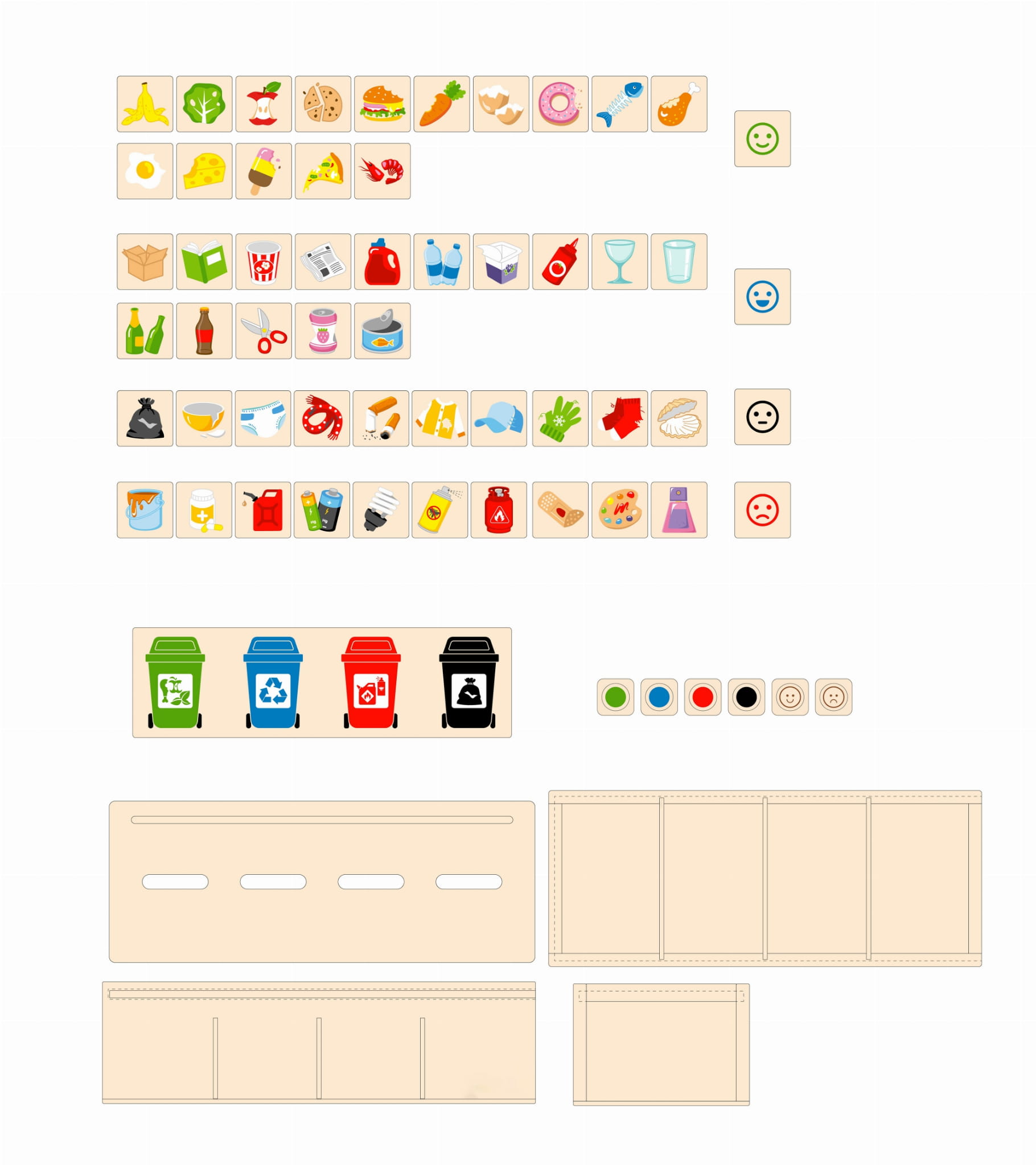 Klasyczna zabawka w nowoczesnym wydaniu, przeznaczona dla dzieci od 3 roku życia. Składa się z 50 drewnianych małych płytek z obrazkami oraz z drewnianej skrzynki zamykanej pokrywką z otworami. Każda płytka posiada inny obrazek odpadu z jednej strony zaś z drugiej buźkę w kolorze odpowiadającym grupie odpadów (kosza) do której należy. Do zestawu dołączona jest dodatkowa większa płytka przedstawiająca pojemniki na śmieci w 4 kolorach. Należy ją zamocować na pokrywce, wówczas nadrukowane pojemniki będą wskazywały odpowiedni otwór do wrzucania małych płytek. Do kompletu dołączone są również 2 kostki do gry.