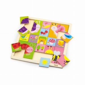 W zestawie kolorowych kreatywnych puzzli od Viga znajduje się dwadzieścia pięć elementów, które należy ułożyć na drewnianej podstawce. Docelowo, należy ułożyć cztery robaczki z 16 kawałków o wymiarze 4x4cm. Pozostałe 9 elementów można układać w dowolnych kombinacjach. Obrazki są w wyrazistych kolorach które przykują uwagę smyka.