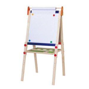 Stojąca dwustronna tablica od firmy Viga to idealny prezent, który ucieszy każde dziecko. Zabawka dedykowana dla każdego malucha, którego pasją jest tworzenie nowych dzieł i obrazków. Najmłodsi uwielbiają rysować dlatego prezentujemy coś co umożliwi im kreatywną zabawę. Z jednej strony planszy możliwe jest pisanie kredą, natomiast po drugiej stronie swobodnie można mazać pisakiem. Tablica wyposażona została w rolkę na której można umieścić papier do rysowania. Dzięki czterem magnetycznym klipsom dziecko z łatwością przyczepi kartkę papieru. Dodatkowo pod tablicą umieszona została półka z regulacją wysokości oraz z miejscem na przybory do pisania i rysowania.
