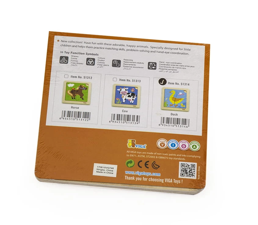 Kolorowe i bardzo proste Puzzle dla Maluszka od Viga z obrazkiem kaczuszki. W zestawie znajdują się cztery elementy, które należy ułożyć na drewnianej podstawce. Gdy pociecha prawidłowo dopasuje kształty powstanie układanka z nowym przyjacielem. Obrazek jest w wyrazistych kolorach które przykują uwagę smyka.