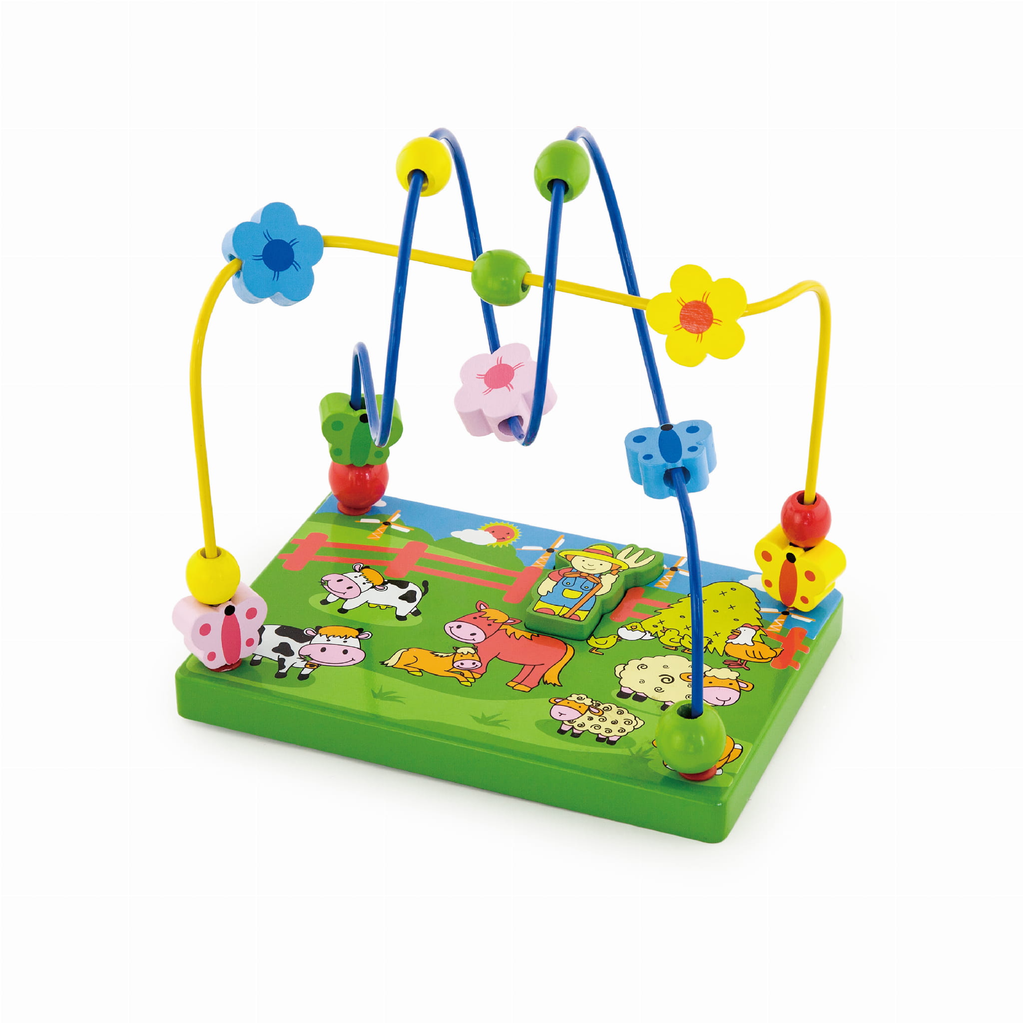 Kolorowa pomalowana drewniana podstawa labiryntu przedstawia łąkę na której znajdują się zwierzęta gospodarskie w zagłębieniu której dołączono figurkę rolnika- farmera, który się nimi opiekuje. Do podstawy przymocowano dwa kolorowe pręty zaplecione w pętle, na których umieszczone są różnokolorowe elementy a wśród nich znajdziemy: motylki, kwiatuszki i koraliki. Pętle labiryntu przestrzennego stanowią wyzwanie dla małych rączek dziecka. Manipulowanie koralikami sprawia masę radości, a przede wszystkim jest wciągające. Zestaw – na Farmie jest odpowiedni do odgrywania ról i gier dla dzieci od 18+ miesiąca dziecka. Zabawka uczy dziecko logicznego myślenia, cierpliwości oraz pomaga w rozróżnianiu podstawowych kształtów i kolorów.
