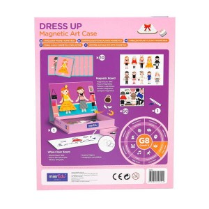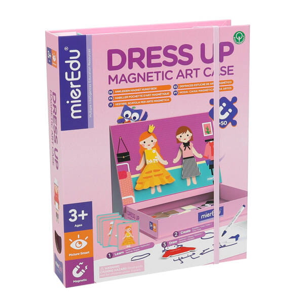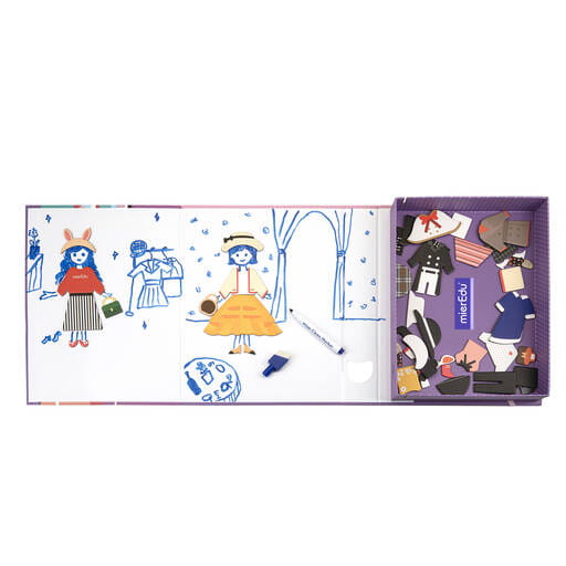 Magnesy w pudełku - Ubieranki od mierEdu. Ten zestaw magnetyczny został stworzony do wspaniałej zabawy. Wewnątrz pudełka kryje się wiele niespodzianek, takich jak karty z ilustracjami ubranek, suchościeralna tablica z markerem i tablica magnetyczna z magnesami. Dzięki magnesom dzieci mogą tworzyć własne stroje. Po rozłożeniu, pudełko zamienia się w dużą tablicę do pisania i rysowania. Karty świetnie sprawdzą się jako podpowiedzi w projektowaniu outfitów. Zestaw zawiera: 50 magnesów, 10 kart oraz 1 zmazywalny marker, wszystko wygodnie spakowane w praktycznym pudełku, które można łatwo przenosić i przechowywać. Ten zestaw to doskonała propozycja dla rozwoju dziecięcej kreatywności, umiejętności rysowania oraz motoryki małej. Poznaj pozostałe artystyczne zestawy magnetyczne od mieEdu.
